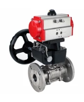 Кран шаровой DN.ru BV3131P(3pc)-FP-F-ISO-H Ду32 Ру40 трехсоставной из нержавеющей стали SS304, фланцевый, уплотнение - PTFE, полнопроходной с пневмоприводом DN.ru PA-DA-052 и ручным дублером MON1-250-T26-ISO с сертификатами качества. Доставка. Гарантия. В наличии! Звоните!